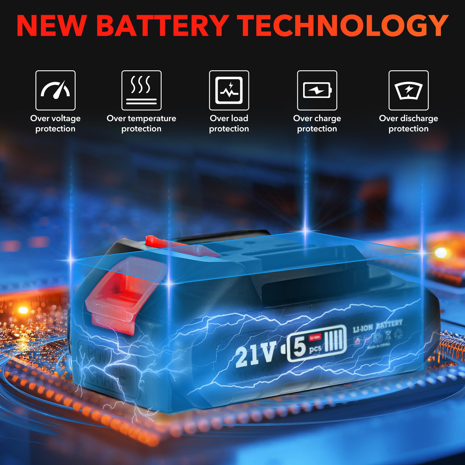 RECHARGEABLE ELECTRIC CHAINSAW: The Electric Chainsaw is equipped with two 21V high-power rechargeable lithium battery, which ensures uninterrupted use, allowing you to tackle bigger tasks without worrying about running out of power, even in the field! Besides, the battery balances the weight so it is easy to handle.